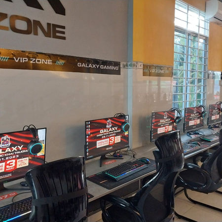 Điểm nổi bật: GALAXY LONG AN mang concept “Đấu Trường Ngân Hà” với cảm hứng từ không gian vũ trụ tương lai – nơi ánh sáng cyan–tím và trần hiệu ứng galaxy tạo cảm giác như bước vào một chiến hạm eSports. Nền xám bê tông – đen matte được nhấn bằng mảng cam nổi bật, vừa mạnh mẽ vừa bắt mắt, lên vibe Galaxy Battlezone đúng chất “combat giữa dải ngân hà”.
