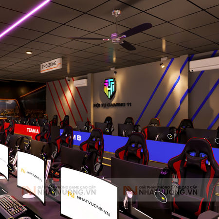 HỘI TỤ 11 – Phòng game phong cách thể thao điện tử Esports tại Thuận An, TP.HCM. Thiết kế hiện đại, LED rực rỡ, cấu hình cao, không gian thi đấu năng động.